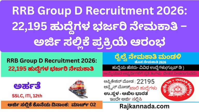 RRB Group D Recruitment 2026: 22,195 ಹುದ್ದೆಗಳ ಭರ್ಜರಿ ನೇಮಕಾತಿ – ಅರ್ಜಿ ಸಲ್ಲಿಕೆ ಪ್ರಕ್ರಿಯೆ ಆರಂಭ ಭಾರತೀಯ ರೈಲ್ವೆ ಇಲಾಖೆಯಲ್ಲಿ ಸರ್ಕಾರಿ ಉದ್ಯೋಗ ಪಡೆಯಲು …