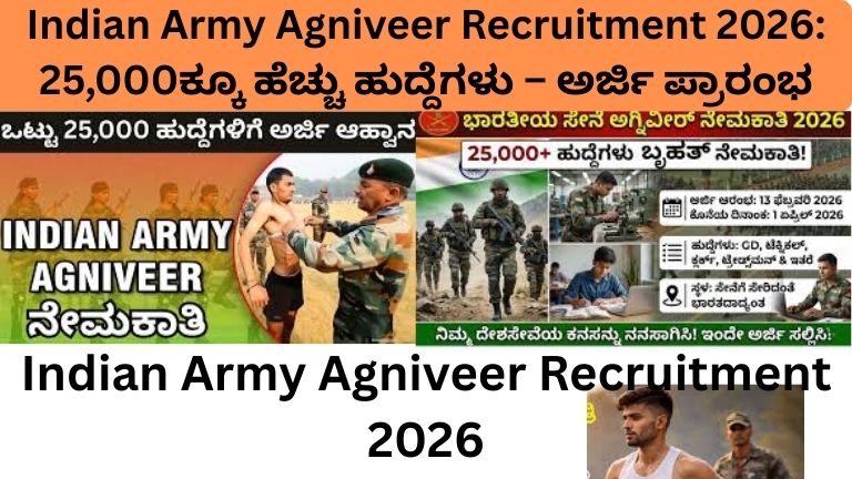 Indian Army Agniveer Recruitment 2026: 25,000ಕ್ಕೂ ಹೆಚ್ಚು ಹುದ್ದೆಗಳು – ಅರ್ಜಿ ಪ್ರಾರಂಭ ದೇಶ ಸೇವೆ ಮಾಡುವ ಕನಸು ಹೊಂದಿರುವ ಯುವಕರಿಗೆ ಭರ್ಜರಿ ಅವಕಾಶ ಒದಗಿಸಿದೆ …