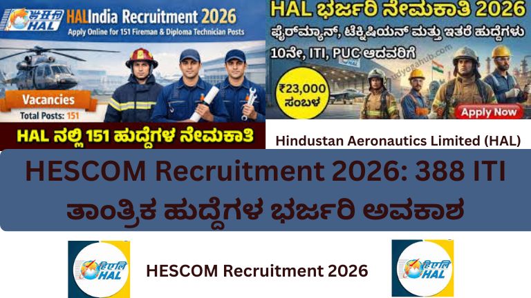HAL Recruitment 2026: 151 ಟೆಕ್ನಿಷಿಯನ್, ಫೈರ್ಮನ್ ಮತ್ತು ಸೆಕ್ಯುರಿಟಿ ಗಾರ್ಡ್ ಹುದ್ದೆಗಳ ಭರ್ಜರಿ ಅವಕಾಶ ಭಾರತದ ಪ್ರಮುಖ ಏರೋಸ್ಪೇಸ್ ಸಂಸ್ಥೆಯಾದ Hindustan Aeronautics Limited (HAL) …